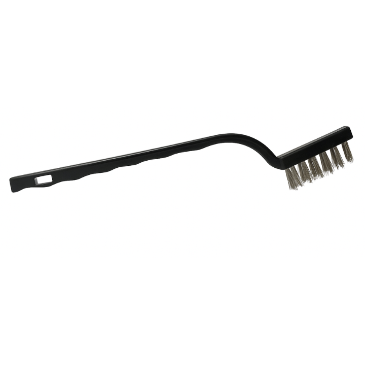 Escova de Aço reutilizável para limpeza de instrumentais cirúrgicos aço inoxidável medindo aproximadamente 38 mm de comprimento e 12,7 mm de diâmetro com cabo plástico em formato anatômico antiderrapante.